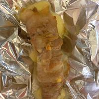 - 5 天板にアルミホイルを敷き、4をのせます。豚バラ肉に火が通るまでオーブントースターで6分程焼きます。※爪楊枝をオーブントースターで加熱すると発火の恐れがあります。目を離さずに様子をみながら加熱してください。