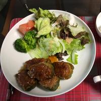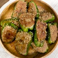 合挽き肉を使い、具とピーマンのつなぎに、ピーマンへ小麦粉をまぶして作ってみました。