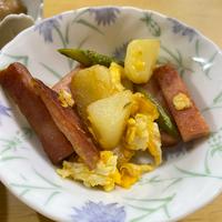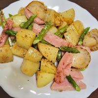- 準備 新じゃがいもは芽を取り除き、皮付きのまま一口大に切っておきます。 アスパラガスは根元を切り落とし、根元1/3の固い皮を剥き、2cm幅の斜め切りにしておきます。 スパムは一口大に切っておきます。