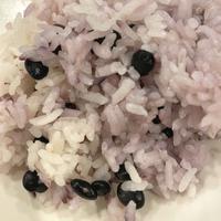 黒豆ごはんのご紹介です。水でしっかり戻した黒豆はふっくらもちもちで、食感のよい仕上がりです。戻し汁を使うと色味も鮮やかできれいですよ。炊飯器でお米と一緒に炊くだけでできるので、ぜひ作ってみてくださいね。