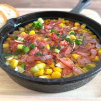 「コーンとベーコンのアヒージョ」の作り方を簡単で分かりやすいレシピ動画で紹介しています。