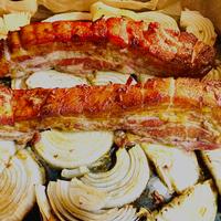 - 3 2の上に1をおき塩こしょうを玉ねぎにかけて200℃に予熱したオーブンで40分豚バラブロック肉に火が通るまで焼きます。