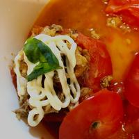 インパクトのある丸ごとトマトの中身は、なんとサバの味噌煮缶詰。味噌煮缶を使うことで、味付けはめんつゆのみで簡単にお作りいただけますよ。バジルのさわやかな香りは、トマトに合うのはもちろん、サバの臭みも和らげてくれます。全てが合わさると旨みが凝縮されてとてもおいしくなり、見た目もかわいい一品です。