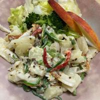 粒マスタードのツブツブが効いて簡単だけと美味しいサラダができあがりました。ピーマンは、赤いのも少し入れました。