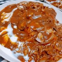 何度か作っていますが、レシピ通りだとやっぱりデミグラスソースの味が濃すぎるので、舌触りを滑らかにする意味でも、デミグラスソースを水で少しずつ伸ばすようにして、コンソメと中濃ソースを追加して味を整えています。