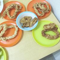 - 2 ほぐれてきたら、5〜6本ずつにし、ねじりながらドーナッツ状にします。