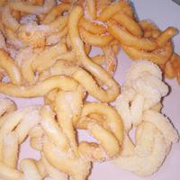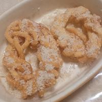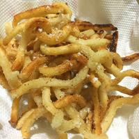 ドーナツ型にしようとうどんをひねると、プチっと切れてしまうので諦めて短く切って揚げました。うどんの塩味と砂糖の甘味がいい感じでした。