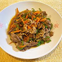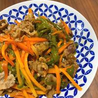 - 3 鍋にサラダ油をひき、強火で牛もも薄切り肉を炒めます。火が通ったら、中火でピーマンとにんじんをしんなりするまで炒めます。