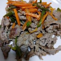 - 1 ピーマンの種とヘタを取り縦に細切りし、にんじんと牛もも薄切り肉は細切りにします。