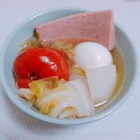 スパムとおでんて合いますね!おいしかったです!トマトは普通の大きさ、キャベツ入れました。