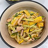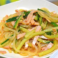 - 1 きゅうりは千切りにします。ハムは半分に切って、さらに5mm幅に切ります。