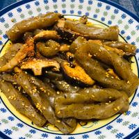 - 1 こんにゃくを1㎝幅に切りねじりこんにゃくを作ります。エリンギは乱切りにします。