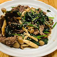 簡単で、ご飯の進むおかず!水は入れずに、しめじを足してボリュームをつけました。ほうれん草は予め湯掻いたものを使用。調味料は、合わせておいて作りました。
