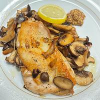 - 12 器に盛り付け、粗挽き黒こしょうをかけます。レモン、粒マスタードを添えて完成です。