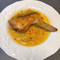 - 7 3を裏返して中火にし、油を回しかけながら焼きます。皮目がパリッとして、火が通ったら取り出して10分程休ませます。