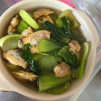 冷凍のあさりを使用しました。沸騰した鍋にチンゲンサイと入れて、熱を通した後、火を消して煮付けました。