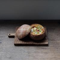 - 1 フランスパンは上部を切り落とし、縁に切り込みを入れて中身を取り出し、空洞にします。切り落とした部分は蓋として使います。