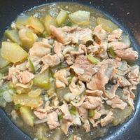 - 3 豚バラ肉の色が変わってきたら(A)を入れ、冬瓜が柔らかくなるまで中火のまま10分程煮込みます。
