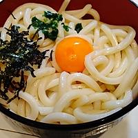 リピートレシピのひとつです。讃岐うどん使用、溶いた全卵を茹でたてのうどんに和えて半熟にしてからだし醤油かけてます。