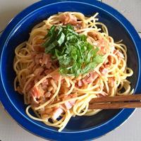 - 1 スパゲッティーは茹でておきます。玉ねぎはすりおろし、大葉は千切りにします。