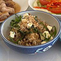 - 2 ボウルに3割炊きもち麦ごはん、1、しょうゆ、かつお節を入れ、全体になじむように混ぜ合わせ2等分にします。