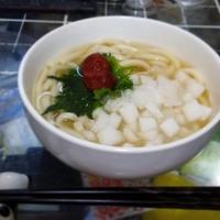 年明けうどんは、純白で太く長い縁起のよい食べ物とされるうどんに、新春のお祝いとして紅い具材を添えて、年始めに食べる事で一年の幸せを願うものとされてます。今回は関西風の透明なお出汁に、シンプルに梅干しと大根おろしで、簡単に作ってみました。是非ご家庭でお試しくださいね。
