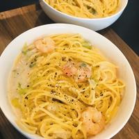 エビと長ねぎでクリームスパゲティにしてみました。エビの食感と長ねぎの旨味がクリームソースとよく合います。今回冷凍のむきエビを使用しましたが、お好みでシーフードミックスを使用しても美味しく頂けます。是非お試しくださいね。