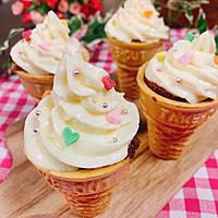 コーンカップにココア生地を流し入れて焼き、クリームを絞った、ソフトクリームのような見た目のカップケーキです。見た目に可愛らしいので、プレゼントなどにもぴったりですよ。トッピングはお好みのものを使って飾ってくださいね。