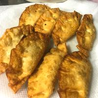 - 4 餃子の皮の中央に3をのせ、周りに水をつけて半分に折り、端から折り込みながらたたみます。
