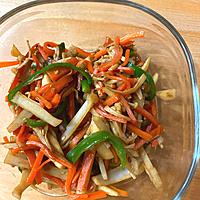 - 2 しめじは手でほぐします。えのきは半分に切り、手でほぐします。にんじんは細切りにします。ピーマンは薄切りにします。
