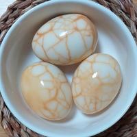 台湾のソウルフード、香辛料で煮たゆで卵、茶葉蛋の紹介です。ゆで卵を殻付きのまま煮込み出来上がりの独特な模様が特徴です。酒や砂糖などを加えて調理するため、スッキリしていながらコクのある味を楽しめます。茶葉は紅茶のほかウーロン茶、ジャスミン茶、プーアル茶などお好みのものをご使用ください。