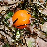 - 5 器にごはんをよそい、1を散らし、3をのせ、2をかけ卵黄をのせ、4を回しかけたら出来上がりです。