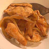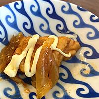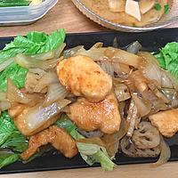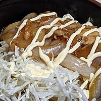 玉ねぎ一個、鶏むね一枚で、砂糖大さじ1以外は調味料2倍でちょっと味薄いかなーって感じ。玉ねぎはしなしなが好みなので先に炒めました。千切りキャベツを下に敷いてます。