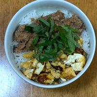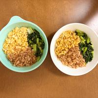大葉がなかったので替わりに小松菜も炒めて三色丼にしました♪