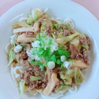 挽肉、しめじ、長ネギ、キャベツ、油揚げで作りました。桜えびが無かったので入れませんでしたが、美味しく出来ました。冷凍うどんでチャチャっと短時間で作れるのでお昼ごはんに助かりました。具材を変えてまた作ってみようと思います♡