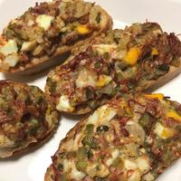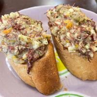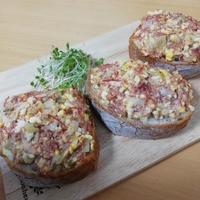コンビーフのタルタルトーストはいかがでしょうか。コンビーフの旨味と、ピクルスの酸味をタルタルソースに加えるといつもと違ったソースに仕上がります。サックサクのフランスパンとの相性も抜群です。是非お試しください。