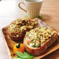 - 3 フランスパンの上にのせ、オーブントースターで10分程焼き、表面に焼き色がついたら取り出します。