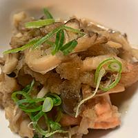 さっぱりとした優しい味わいが特徴の一品です。鮭とまいたけの相性が抜群で、まいたけのコリコリした食感も楽しめます。大根おろしは水分を軽く絞る程度にすることがポイントで、汁気を残すことで味のバランスが整います。ポン酢の爽やかな酸味と大根おろしの風味が鮭の旨みを引き立て、ご飯がすすむ美味しさです。しめじやエノキを加えてアレンジするのもおすすめです。