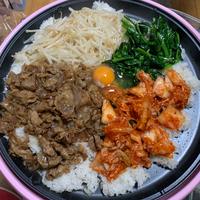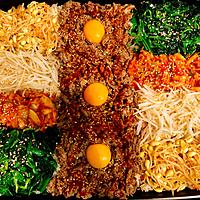 - 8 ごはんの上に2、3、4、6、キムチをのせ、最後に卵黄をのせて完成です。