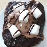 - 5 お皿に盛りつけてマシュマロを乗せ、チョコレートソースをかけて完成です。
