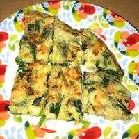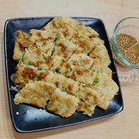 - 3 フライパンにごま油を入れ、中火で熱し2を流し入れます。生地の周りに火が通り固まってきたら裏返し、火が通ったら食べやすい大きさに切ります。