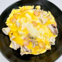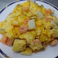 - 4 エビの色が変わったら強火のまま、溶き卵を流し入れ、菜箸で大きくかき混ぜます。半熟状に固まったら火から下ろします。