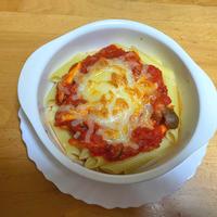 トマトソースとペンネを絡めてから焼きましたが、それでもおいしかったです😊