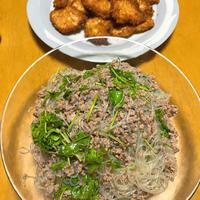 なんちゃってタイ風ヤムウンセンです。 具は挽き肉だけですが、もちろんお好みでシーフードを入れると更にそれっぽく仕上がります! パクチー好きにはたまらない、とまらなくなる春雨サラダを是非女子会に!大ウケ間違いなしです。