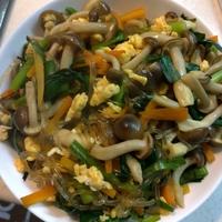春雨100gにニラ、卵、しめじ1袋、人参半分で作りました。
