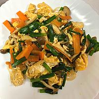 食べレポににんじんやしめじを入れてるのがあったので、参考にしました。卵3こ、ニラは一束、春雨は30gにんじん1/2本しめじ1株、味つけは2倍の4人分で作りました。これを3人で分けてちょうど良い量のメインおかずになりました。