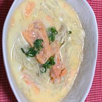 - 7 サーモンに火が通ったら、無調整豆乳を加え沸騰しないよう中火で5分程煮込みます。
