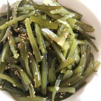 しょうゆや酢の量は、お好みで調整してください。今回は塩気のない、湯通し済みの、生食用の茎わかめを使用しています。生食用の茎わかめの代わりに、塩気のある茎わかめでも代用していただけますが、塩抜きを行ってから使用してください。