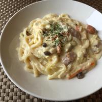 うどんのもちもち食感とクリーミーなソースが絶妙に絡み合う一品です。生クリームや牛乳、豆乳など好みの材料で作れ、ベーコンやしめじ、玉ねぎなどお好みの具材でアレンジ可能。失敗知らずの簡単レシピで、濃厚なソースは卵のコクと粉チーズの風味が効いています。仕上げのブラックペッパーがアクセントになり、パスタとはまた違った食べ応えを楽しめます。