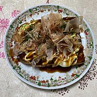 - 5 器に盛り付け、マヨネーズ、お好み焼きソース、かつお節、青のりをかけたら完成です。